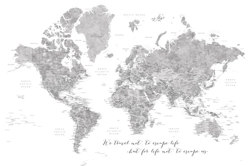Juliste We travel not to escape life, gray world map with cities