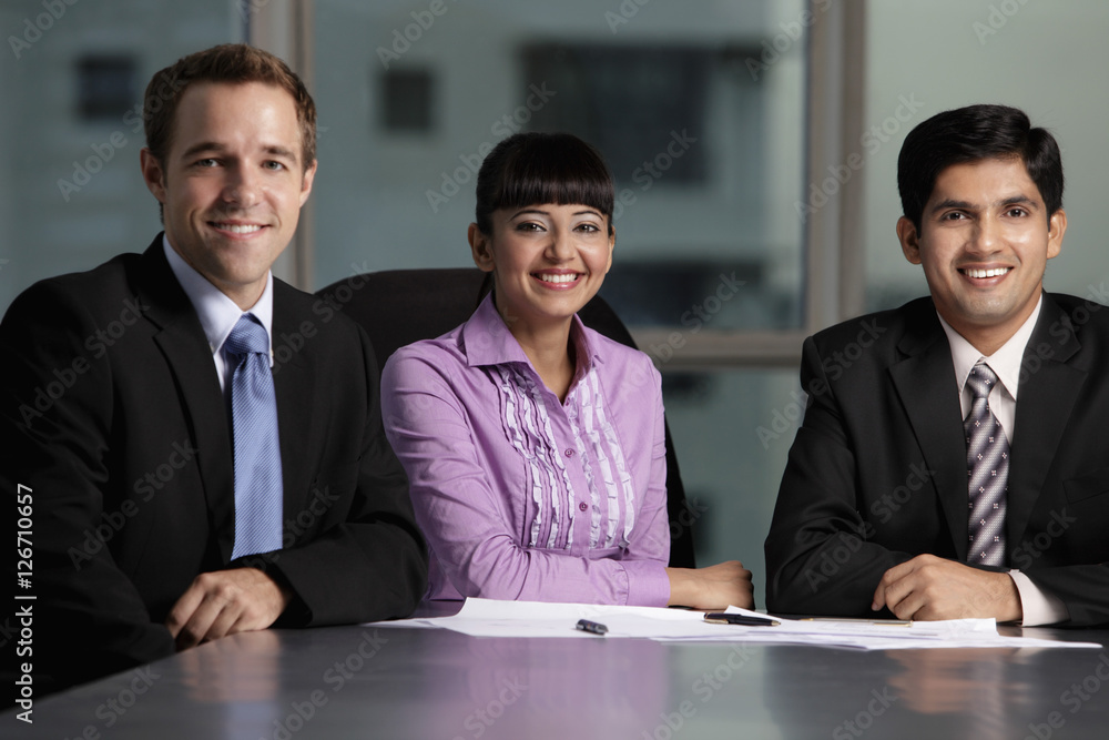 Canvas-taulu Mixed raced group sitting at table smiling.