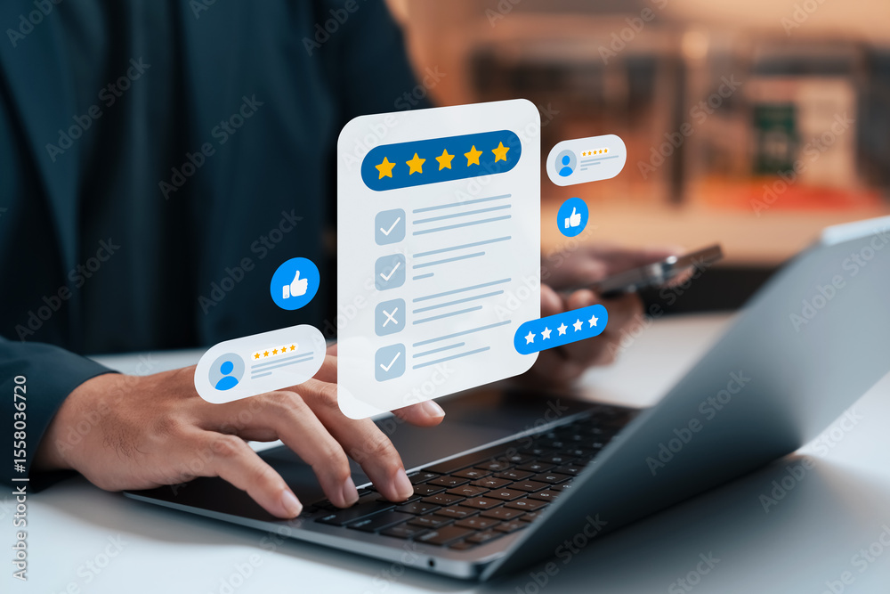 Canvas-taulu Customer review and satisfaction feedback, showing businessman using laptop and smartphone with five-star rating, checklist, thumbs up icons, online service evaluation, digital reputation management