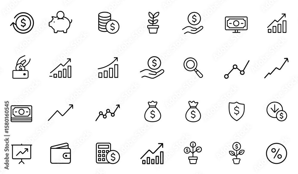 Canvas-taulu Financial profit line icon set, editable stroke icons for money income, savings, cash, investment, banknote, exchange, revenue, growth, economy, market trend analysis vector illustration