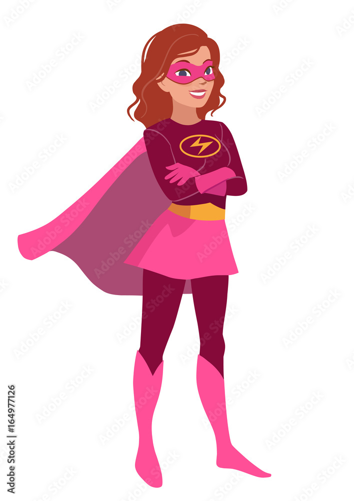 Canvas-taulu Vector cartoon character illustration of a friendly smiling confident young Caucasian woman wearing a Superhero costume with cape and mask, standing with folded arms, in contemporary flat style