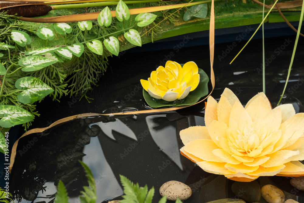Canvas-taulu Artificial water lilies in ponds with stones. Grass of autumn.