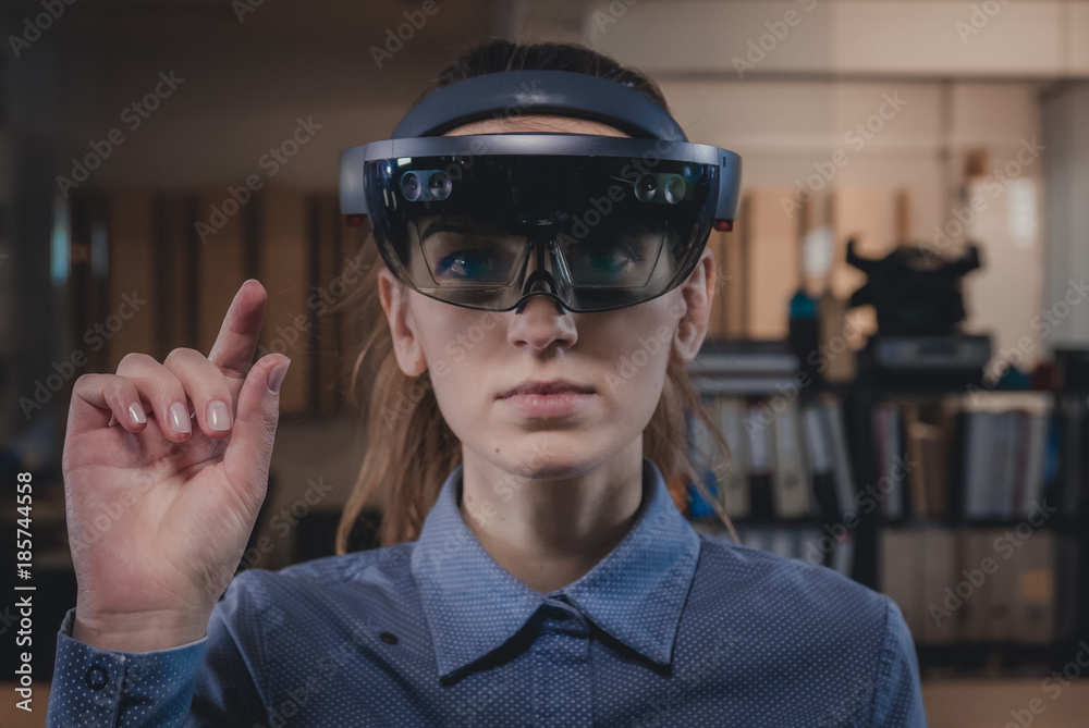 Canvas-taulu Portrait of young Caucasian female using augmented reality holographic hololens