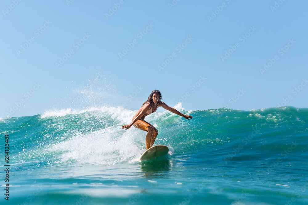 Canvas-taulu Beautiful young brunette girl in a bikini swimsuit ride wave