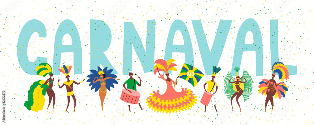 Canvas-taulu Hand drawn vector illustration with dancing people in bright costumes, drummers, Portuguese text Carnaval