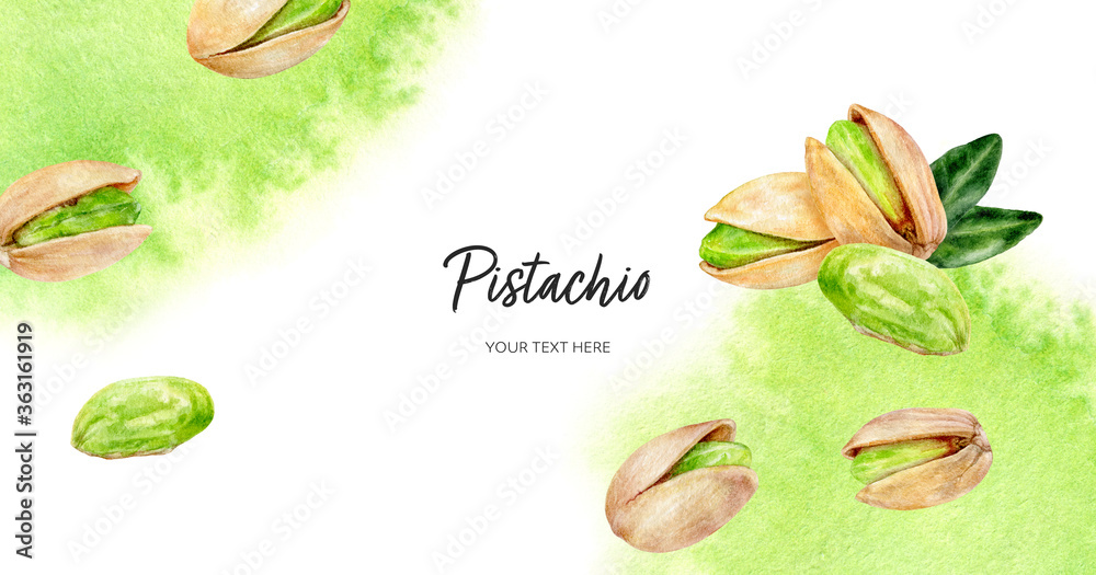 Canvas-taulu Pistachio horizontal banner watercolor hand drawn illustration with watercolor splash background on white