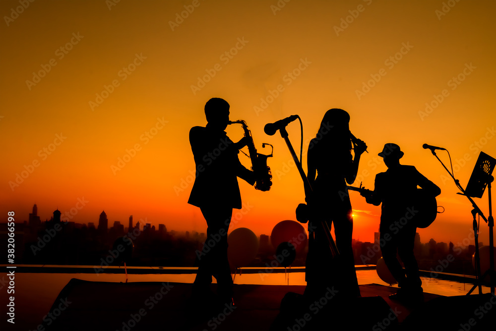 Canvas-taulu Silhouette twilight scene of trio musician background.