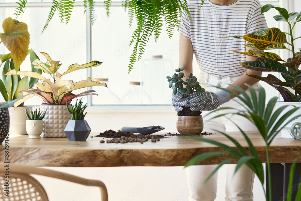 Canvas-taulu Woman gardeners transplanting plant in ceramic pots on the design wooden table