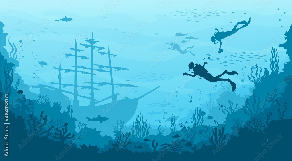 Canvas-taulu Underwater landscape with sunken sailing ship and divers
