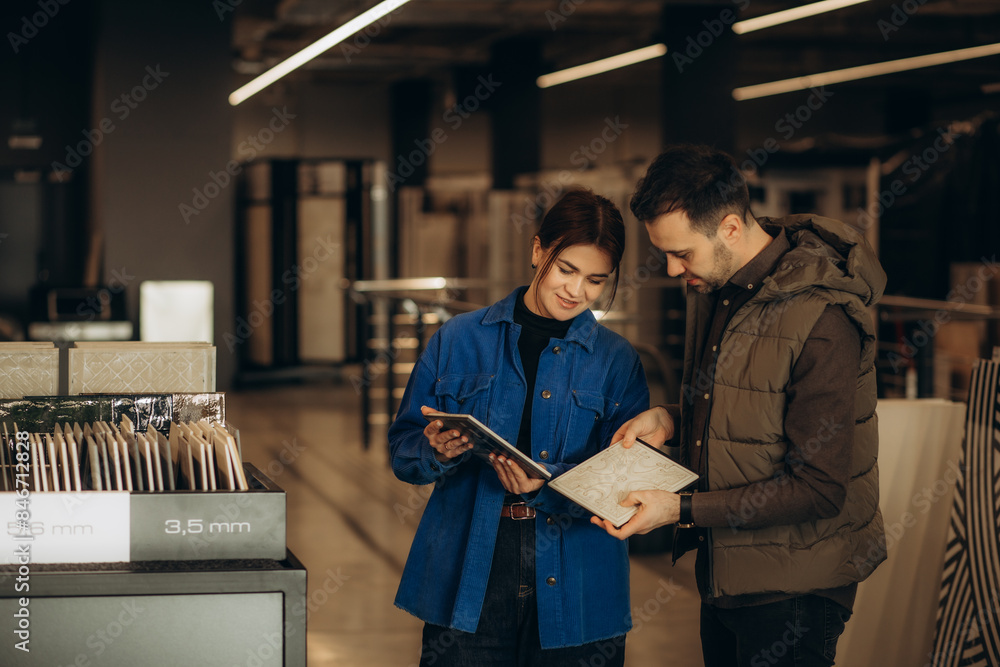 Canvas-taulu Beautiful young couple choosing big granite tiles for their house repairment in