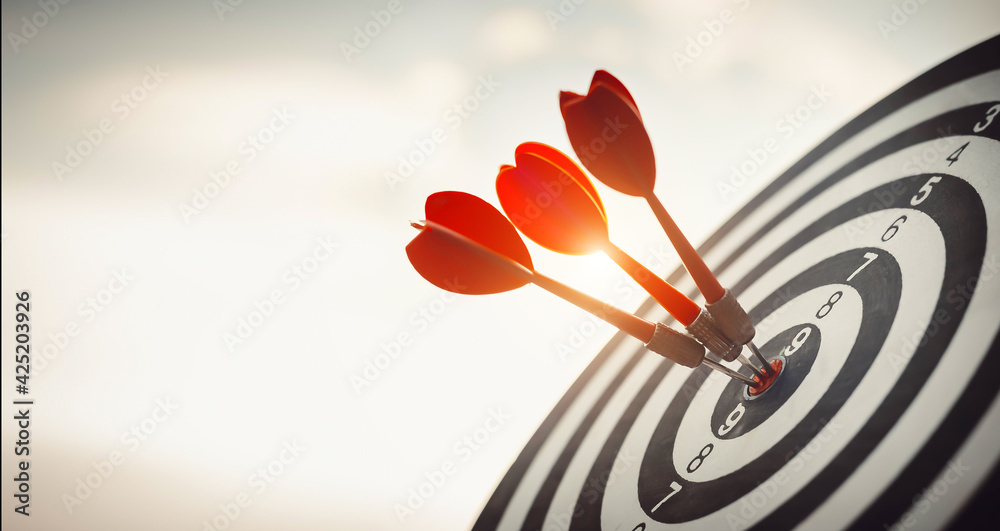 Valokuva Close up shot of the dart arrow hit on bulleyes of dartboard to represent that the business reached the target with dark tone picture style