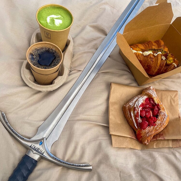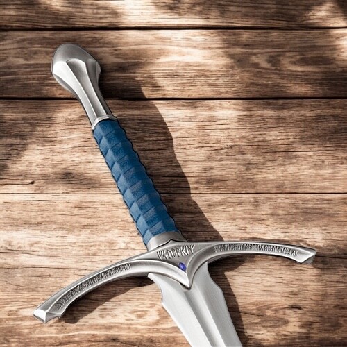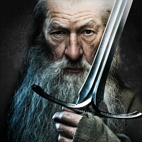 Gandalf Harmaan ikoninen ase ja ylellinen kopio Hobitti-elokuvatrilogian Glamdring-miekasta, joka on valmistettu 1:1 mittakaavassa ruostumattomasta teräksestä.