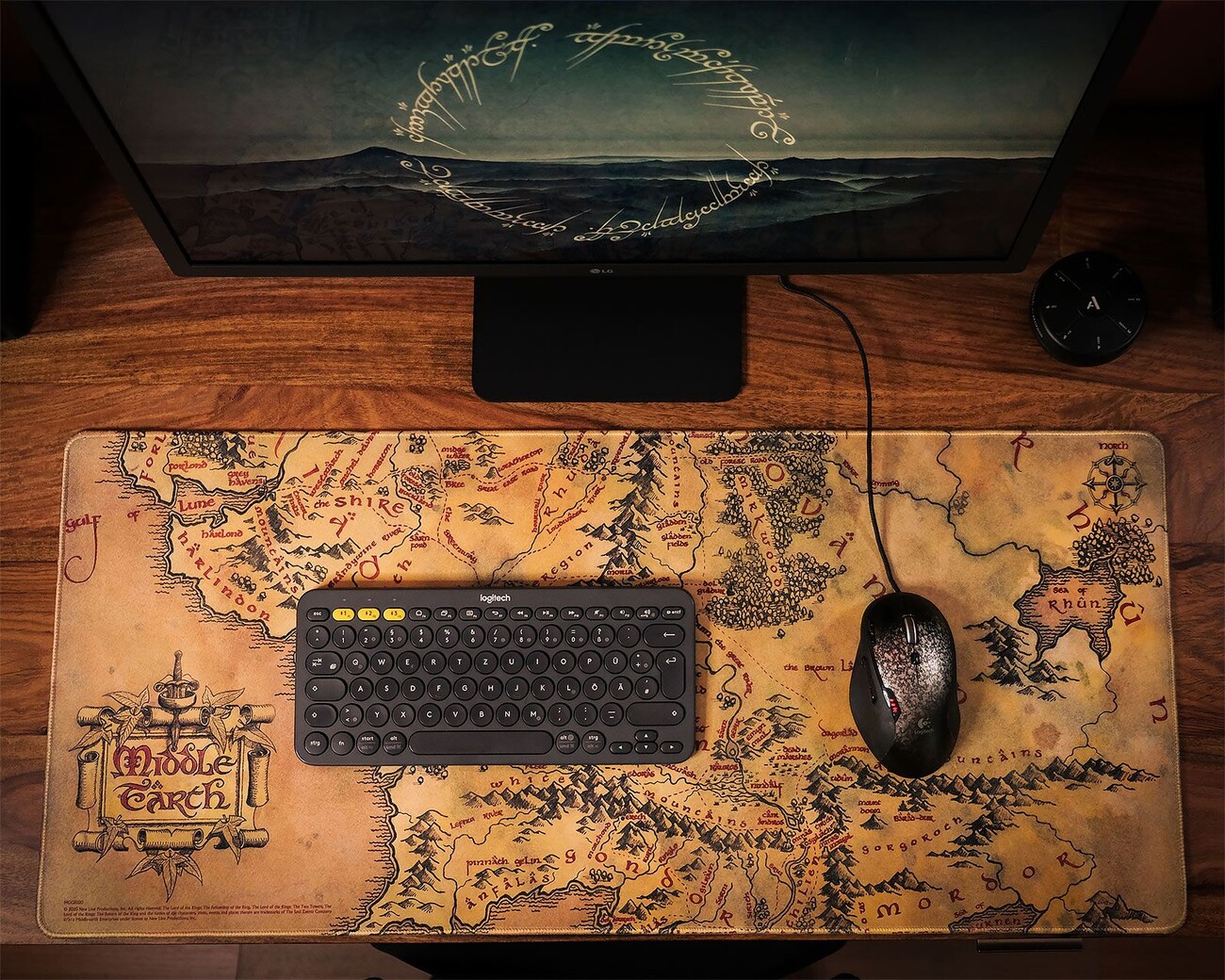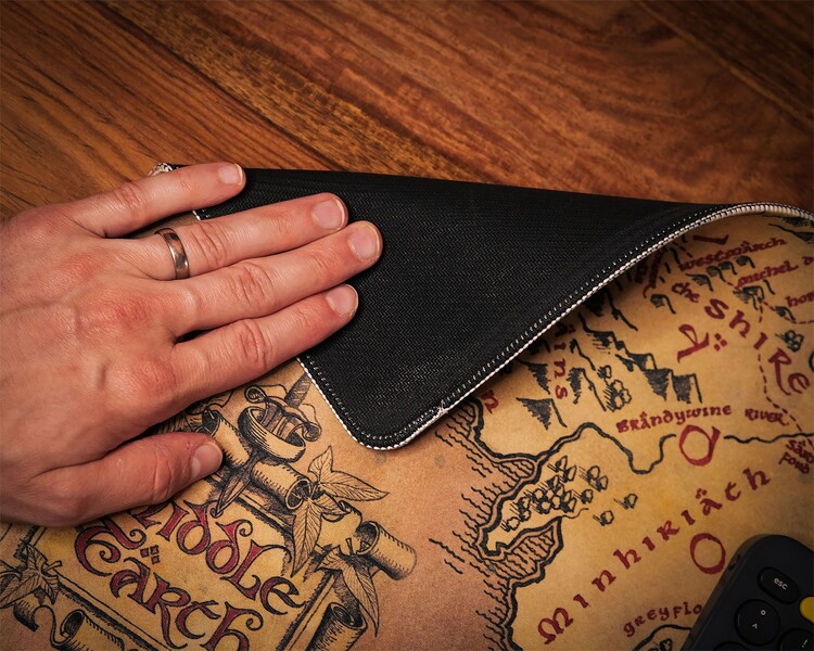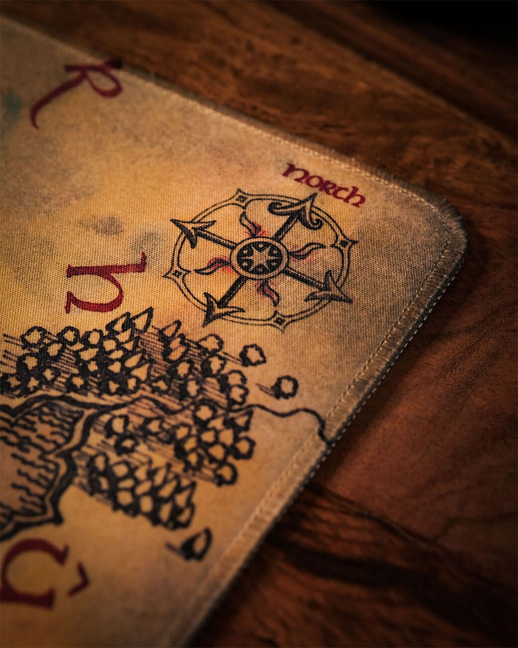 Hiirimatto yksityiskohtaisella Keski-Maan kartalla, joka peittää koko pöydän. Tiivis tekstiilipinta takaa tarkan ja mukavan hiiren hallinnan. Se on vedenkestävä, vahvistetuilla reunoilla ja liukumattomalla kumipohjalla, jotta se pysyy tukevasti paikoillaan.