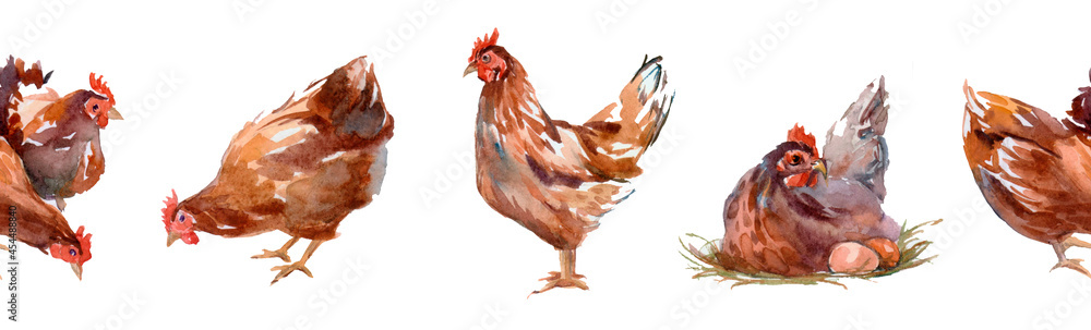 Valokuva Flock Of Chickens Including Hens And Roosters In Open Grassy Field On White Background