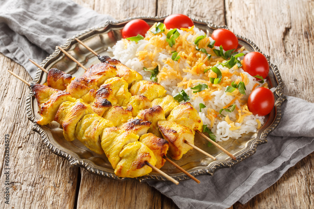 Valokuva Joojeh Kabab is a deliciously tender Persian chicken kabob that has a unique saffron flavour served with rice closeup on the plate on the table