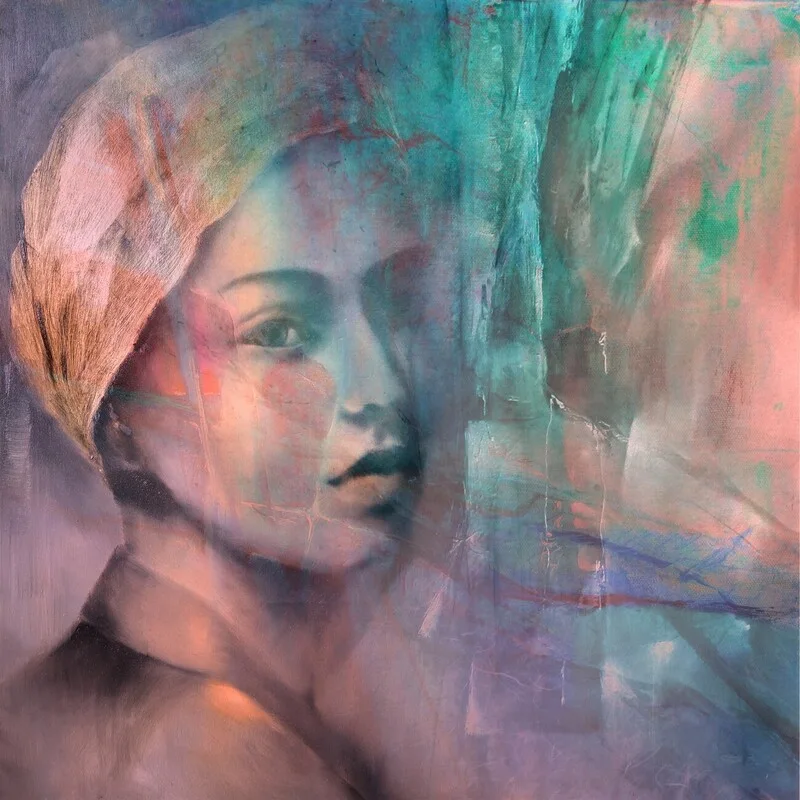 Juliste The girl with the golden hairscarf in the rose and turquoise light