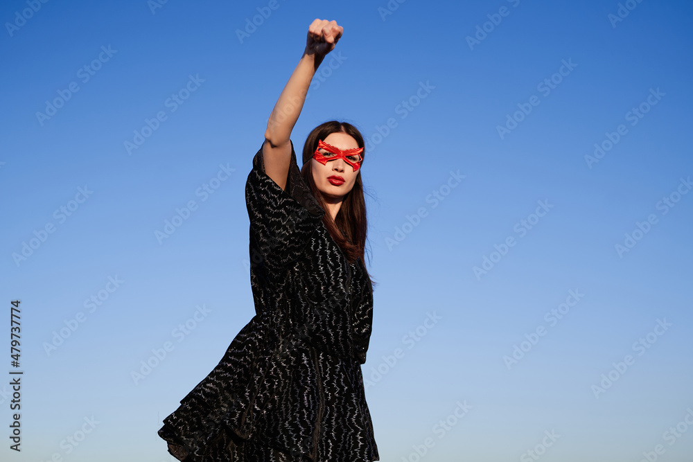 Valokuva Portrait of strong supergirl in black dress and red face mask making fist pump, protesting for freedom and equality on blue sky background