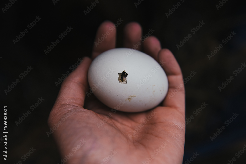 Valokuva Silkie chicken hatching cracking eggs, broody hen with chicks