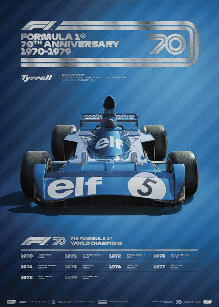 As Formula 1 completes seven decades of racing, this range of 8 special artworks has each one dedicated to a decade of racing from the 1950s to the present day, plus an additional one looking to the future of the sport. The stars of the 1973 season were Jackie Stewart and his car, the *Elf Tyrrell-Ford 006* car. Tyrrell, founded by Ken Tyrrell, started racing in 1958 and started building its own cars in 1970. The team experienced its greatest success in the early 1970s, when it won three Drivers' Championships and one Constructors' Championship with Jackie Stewart. In deference to the principal sponsor, the Elf fuel company, the car was painted in French racing blue.