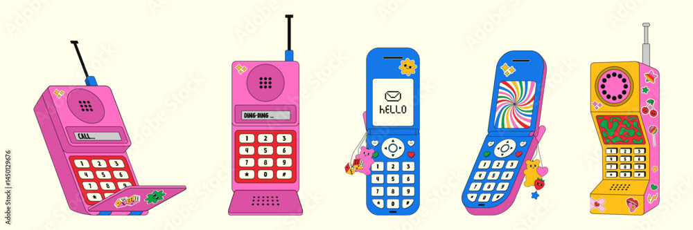 Seinätarra Set of various retro mobile phones covered in eye-catching stickers highlights unique designs and nostalgic charm, capturing the fun aesthetics prevalent in the 90s and early 2000s