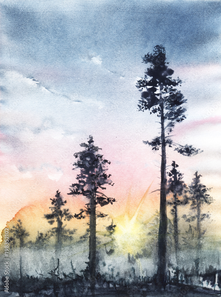 Seinätarra Silhouettes of age-old pines, Through the trunks can see the setting sun