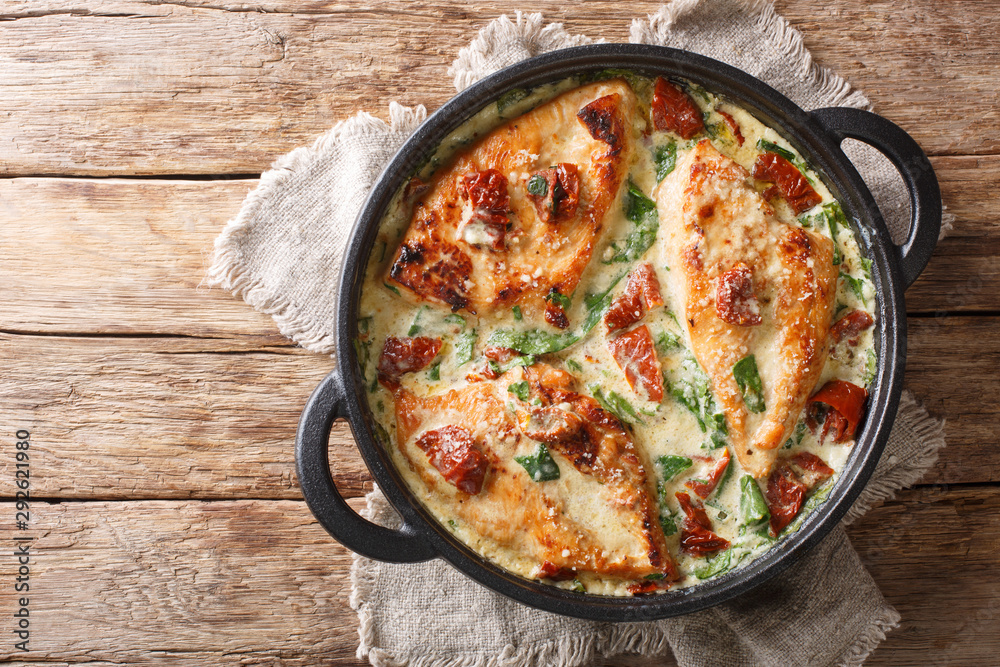 Seinätarra Main course baked chicken with sun-dried tomatoes and spinach in cheese sauce close-up in a pan