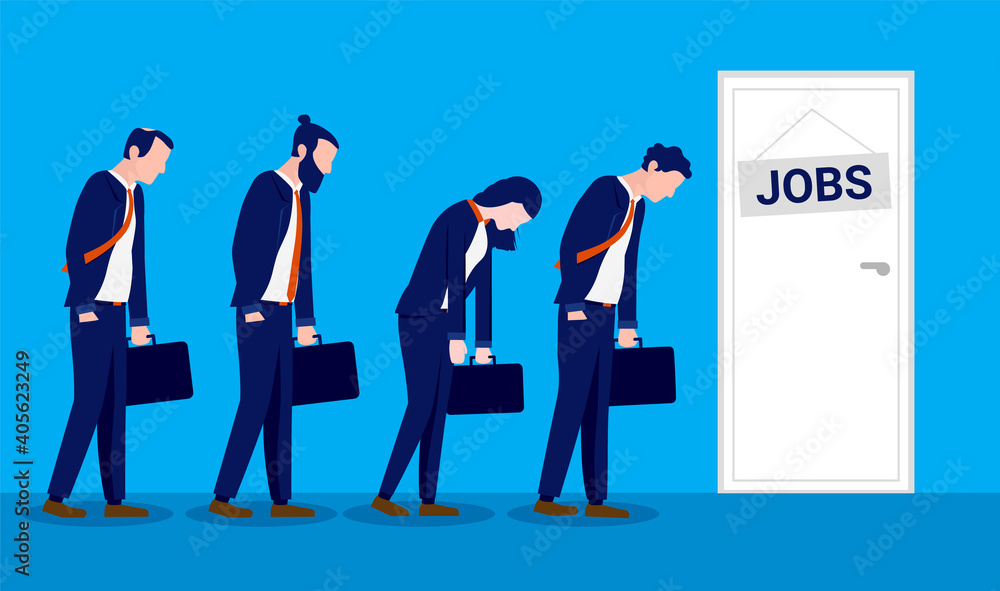 Seinätarra Unemployment line - Sad business people looking for work outside door with the word jobs