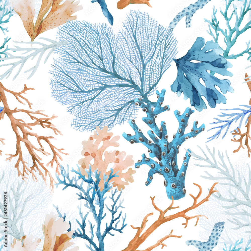 Seinätarra Beautiful vector seamless underwater pattern with watercolor sea life colorful corals