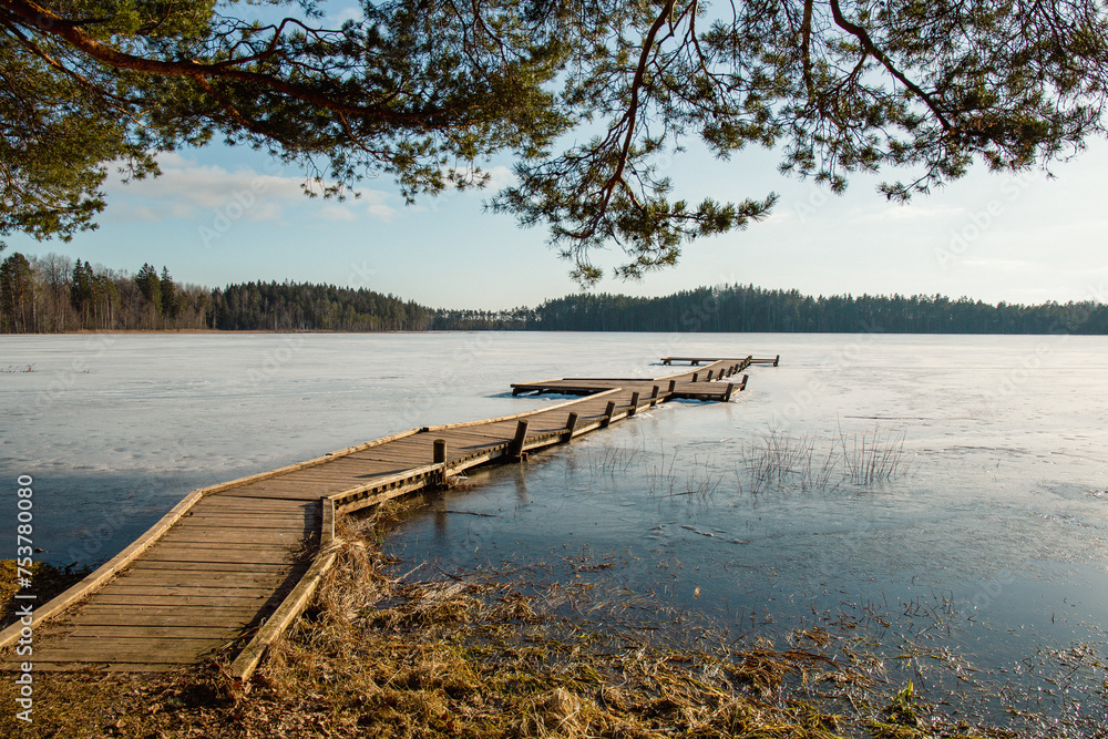 Seinätarra Wooden footbridge in Ratnieku frozen lake in early spring in March in Ratnieki i