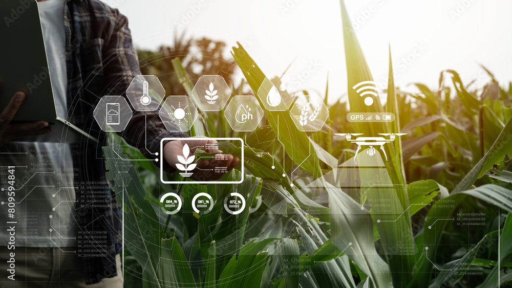 Seinätarra Farmer uses digital tablet in corn field with smart farming interface icons and effects