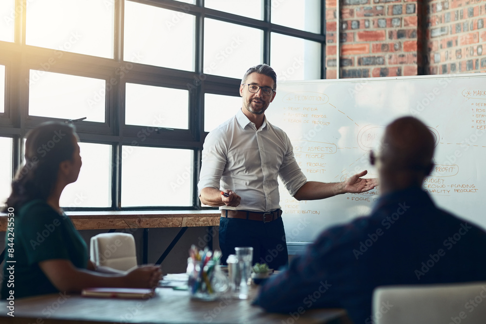 Seinätarra Office, man and whiteboard with presentation for business people, employees and corporate meeting