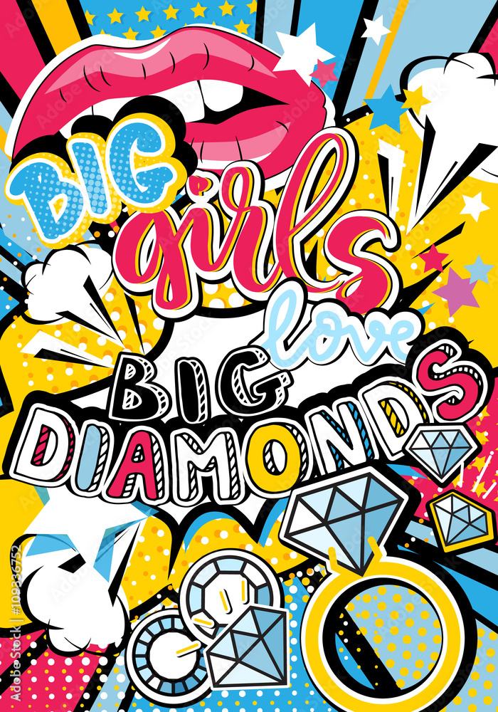 Valokuva Pop art Big girl love big diamonds quote type with lips, diamonds and stars vector elements