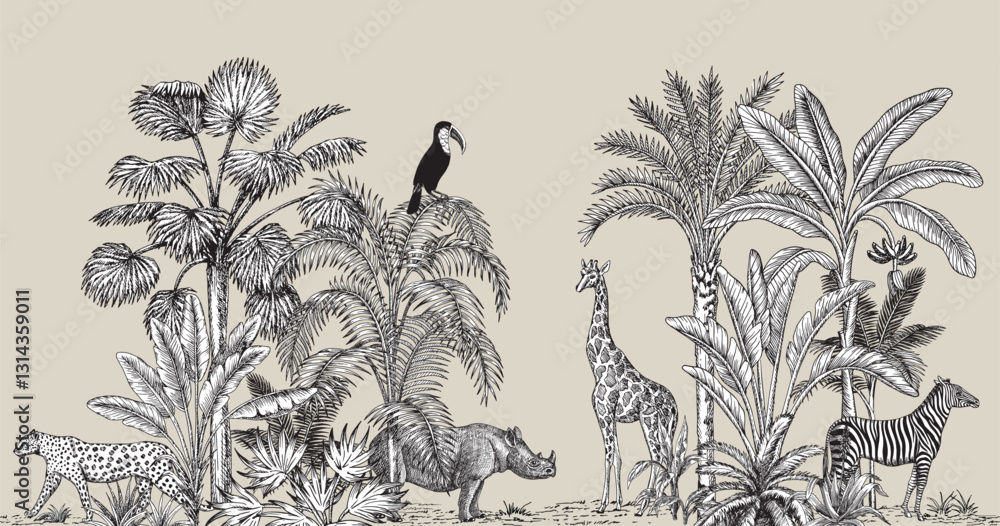 Valokuva Toile tropical vintage botanical palm trees, banana tree, plants, giraffe, rhino, leopard, zebra animal, toucan seamless border