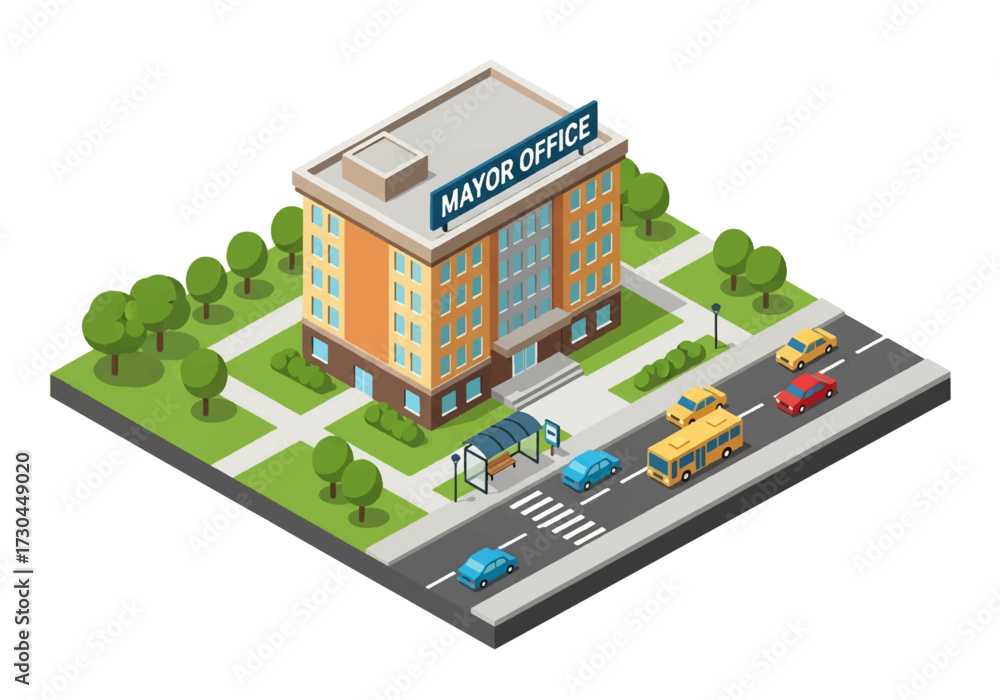 Valokuva 3D Isometric view illustration of a mayor’s office building, dome roof, nearby t