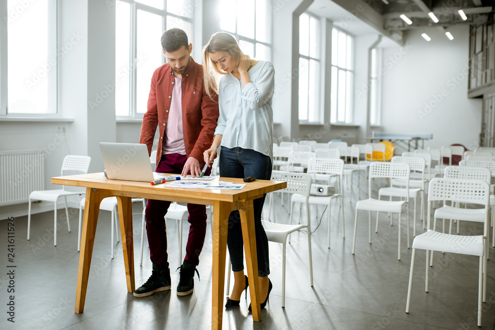 Valokuva Young man and woman preparing presentation working with laptop in the conference