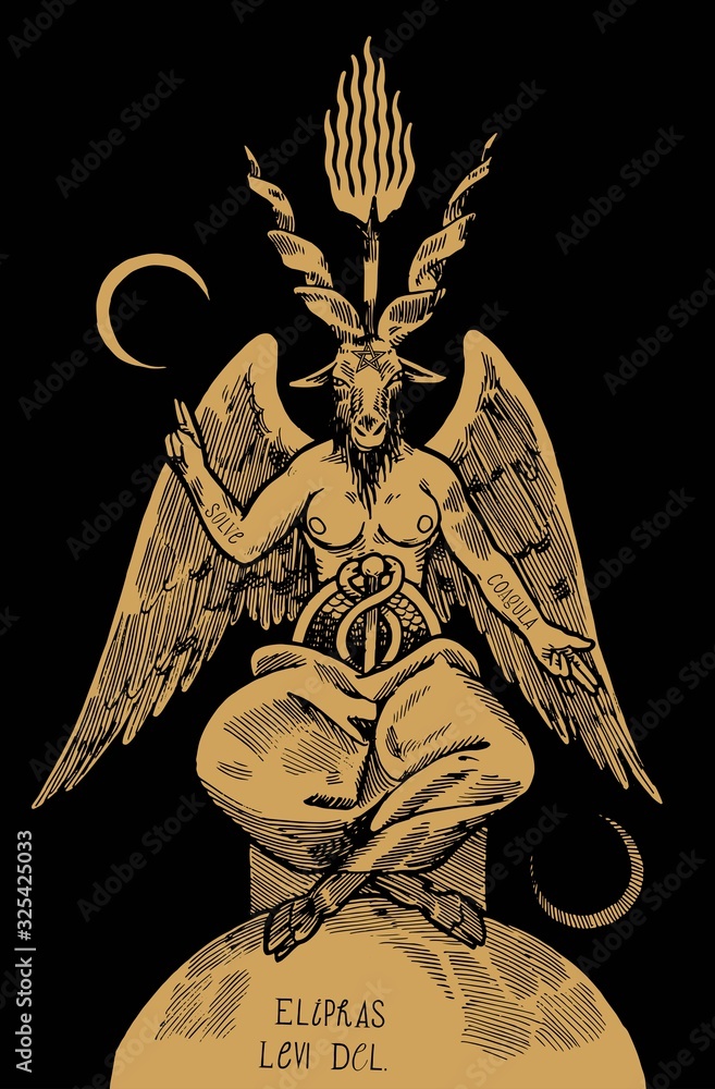 Valokuva Goat headed demon Baphomet with torch on top of his head and big black wings siting an pointing with his hands on two moons