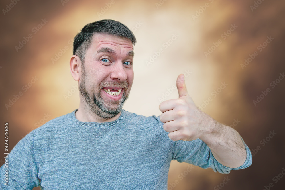 Valokuva cheerful charismatic bearded young man with no front upper teeth gives a thumbs