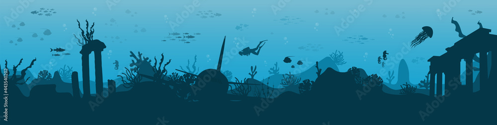 Valokuva Silhouette of coral reef with fish and scuba diver on a blue sea background