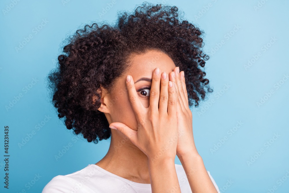 Valokuva Portrait of young scared afraid frightened african girl cover face with hands st