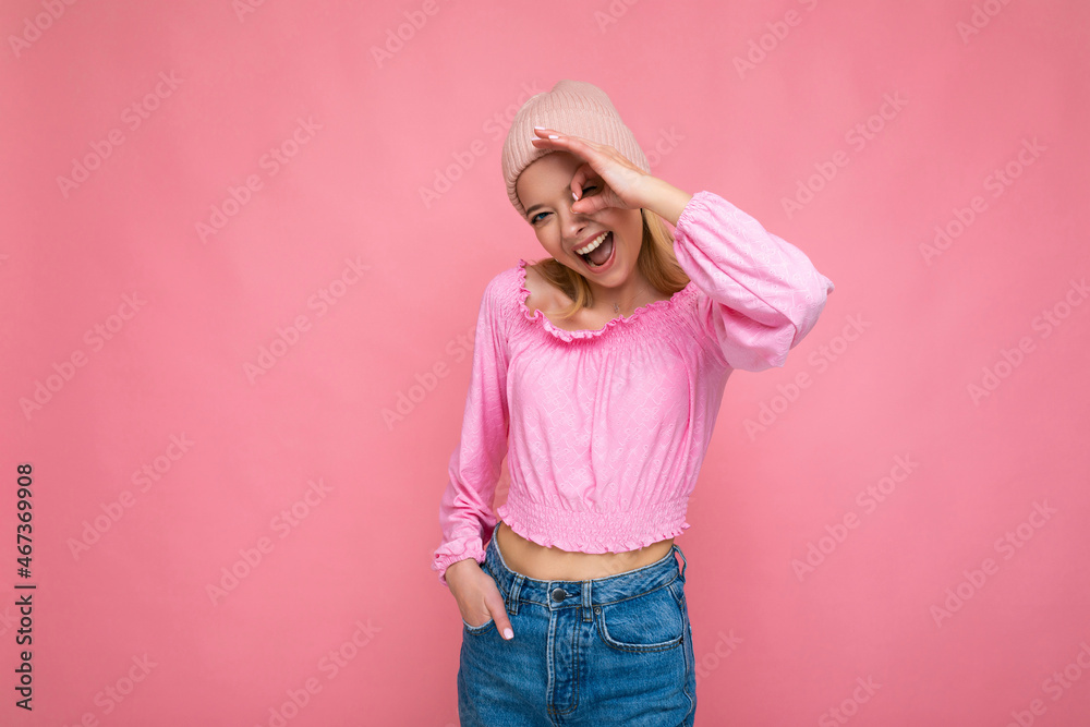 Valokuva Photo of beautiful happy amusing young blonde female person isolated over pink b