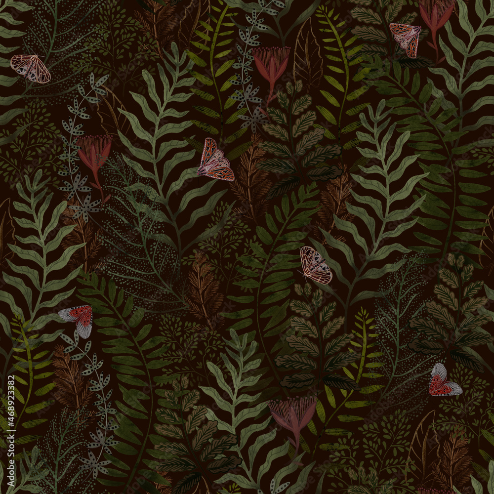 Valokuva Hand drawn Ferns seamless pattern, forest plants with butterflies dark backgroun