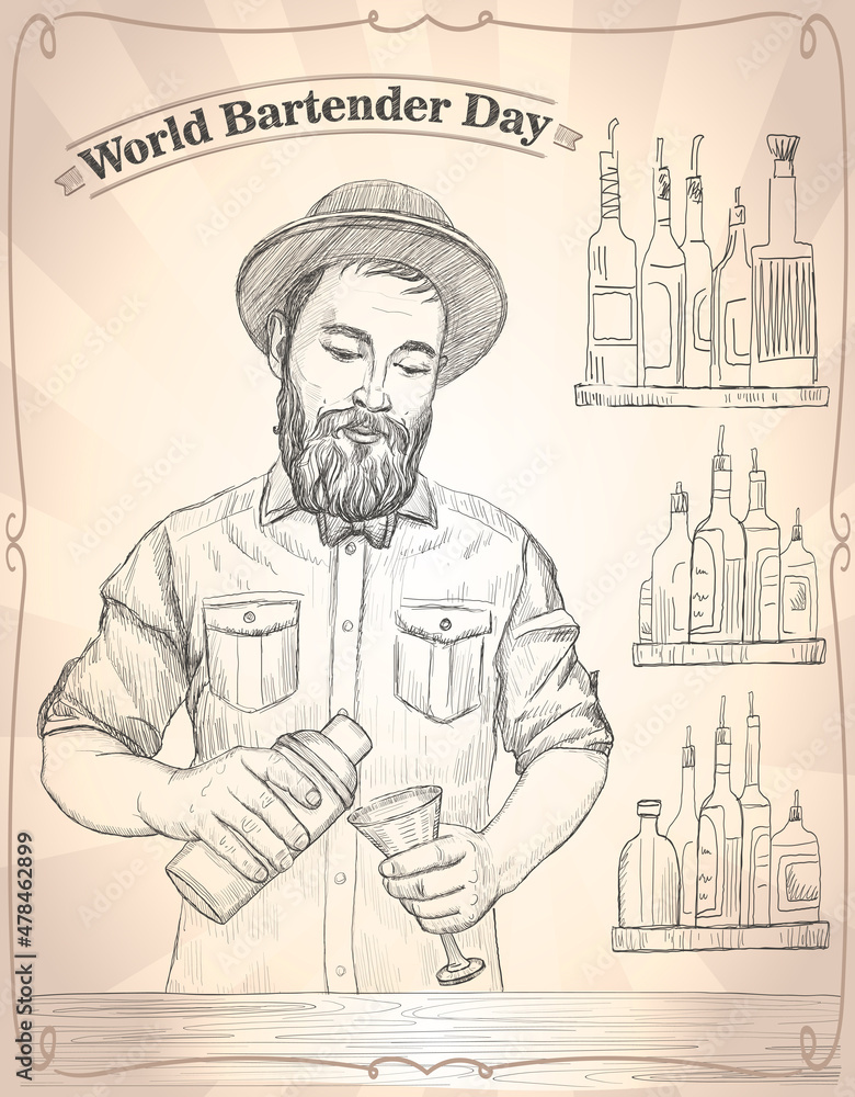 Valokuva World bartender day card, hand drawn graphic illustration with male barmen