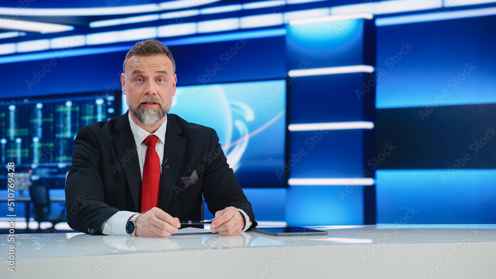 Valokuva Beginning Evening News TV Program: Anchor Presenter Reporting on Business, Economy, Science, Politics