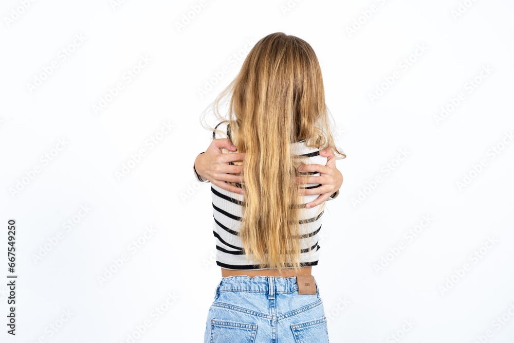 Valokuva Beautiful caucasian teen girl wearing striped T-shirt hugging herself happy and positive from backwards