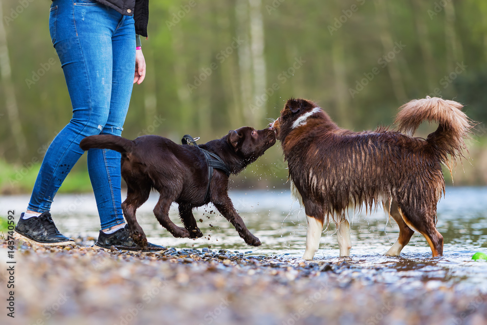Valokuvatapetti young woman with two dogs at the river