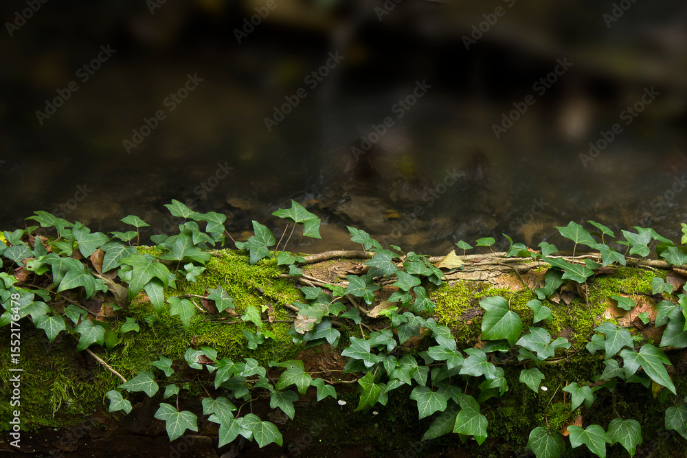Valokuvatapetti ivy on a fallen mossy log close-up