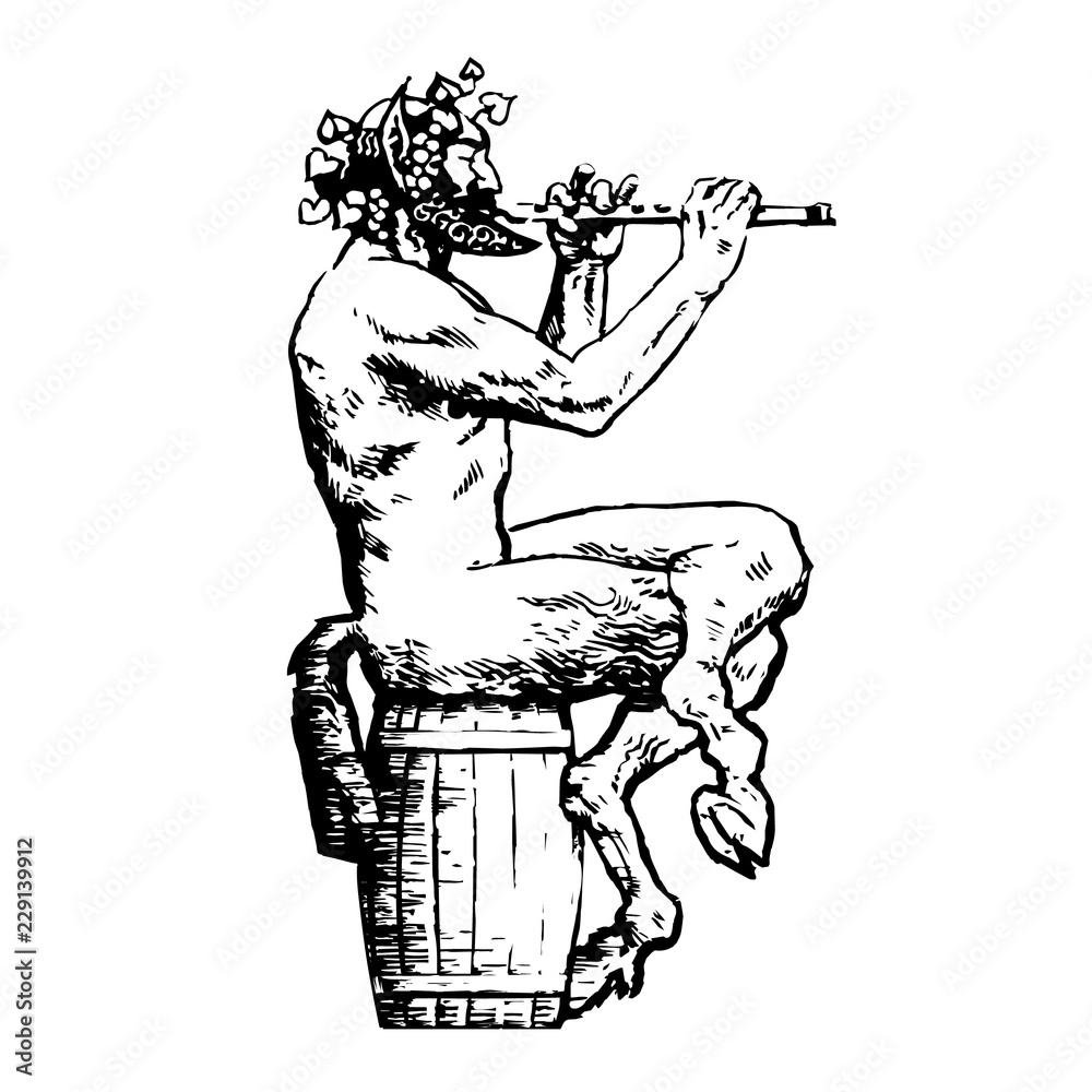 Valokuvatapetti Satyr sitting on wooden barrel and playing flute