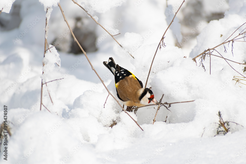 Valokuvatapetti Goldfinch, a multi-colored colorful bird from the Finch family sits on a branch of a Bush with seeds and pecks them