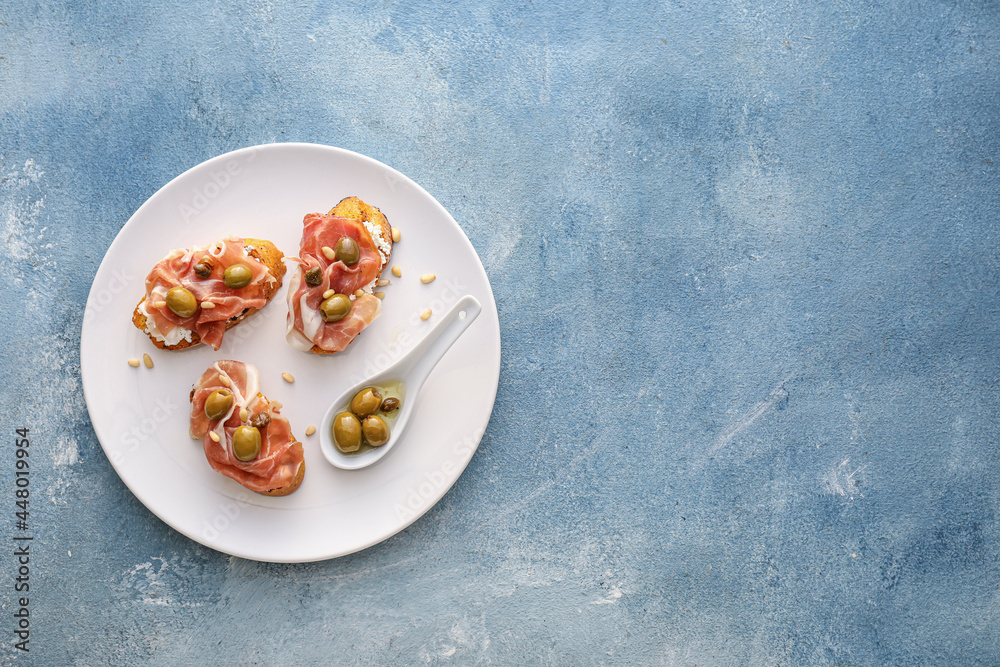 Valokuvatapetti Tasty bruschettas with cheese, prosciutto and olives on color background