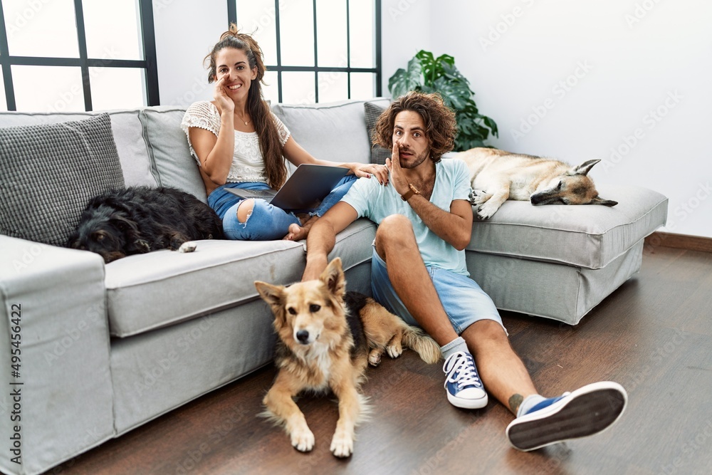 Valokuvatapetti Young hispanic couple with dogs relaxing at home hand on mouth telling secret ru